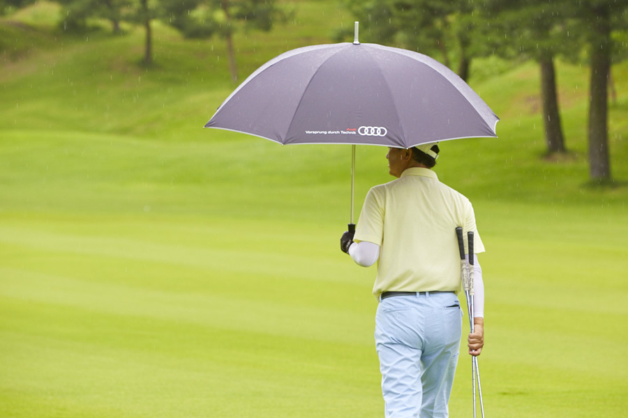雨の日に特に注意すべきなのがスイングのリズム。レインウェアを着ると動きづらくなるため、テイクバックが普段より上がりにくくなります。